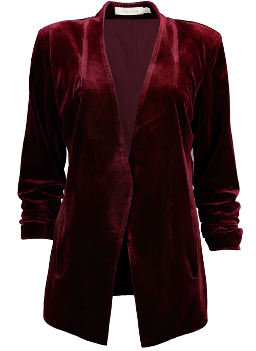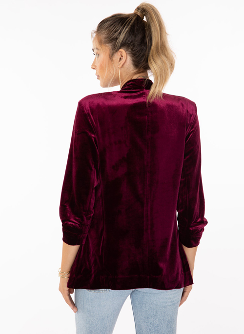 It's blazer season, The Holiday Blazer is crafted from a statement making velvet fabric, with ruching on the sleeves and asymmetrical hem.