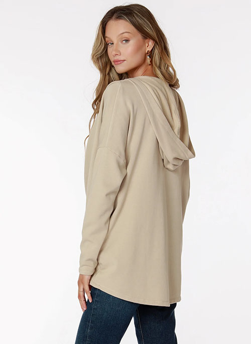 Edgy, cool, and versatile, this will soon be your go to layering piece! This street-style hoodie has a slouchy hood, cowl wrap front body, tunic length, and side seam pockets. Truly a one-of-a-kind sweatshirt!