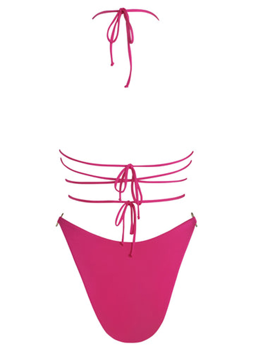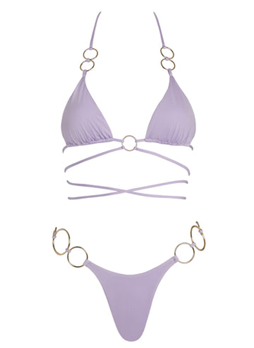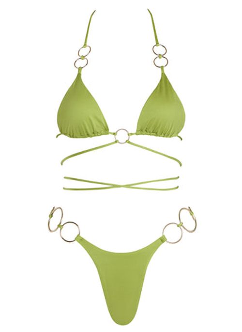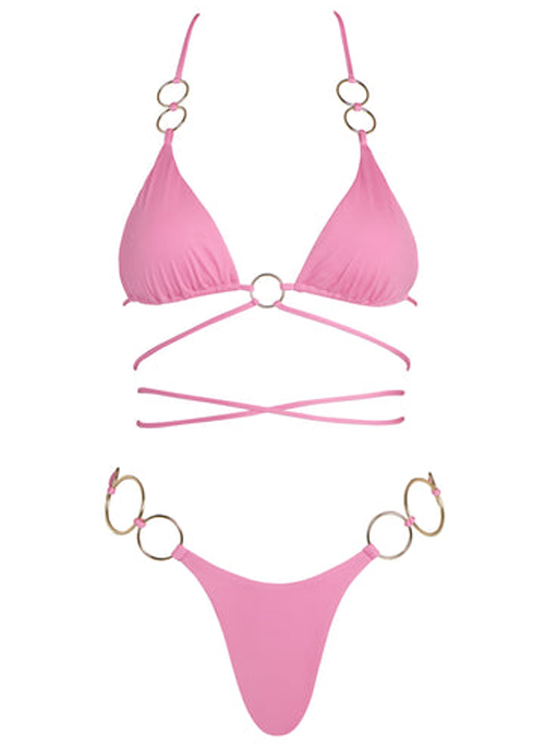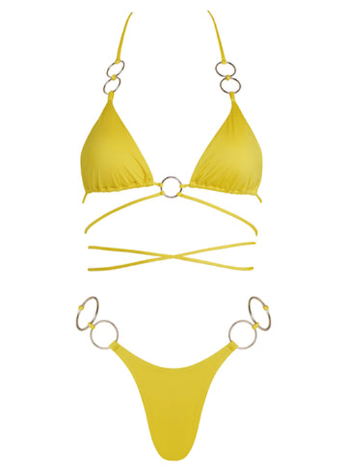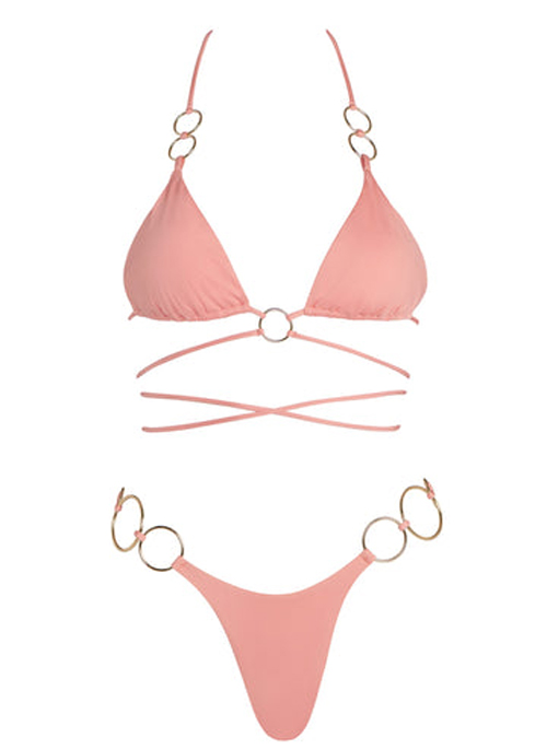 - Padded triangle top with 2 gold rings on each side and 1 in the center, removable padding in bra cups, ties around neck and chest.
