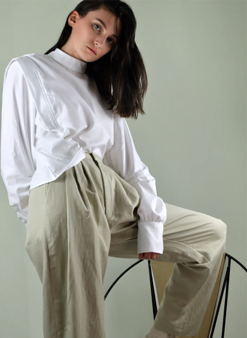 - Beige high waisted pants,