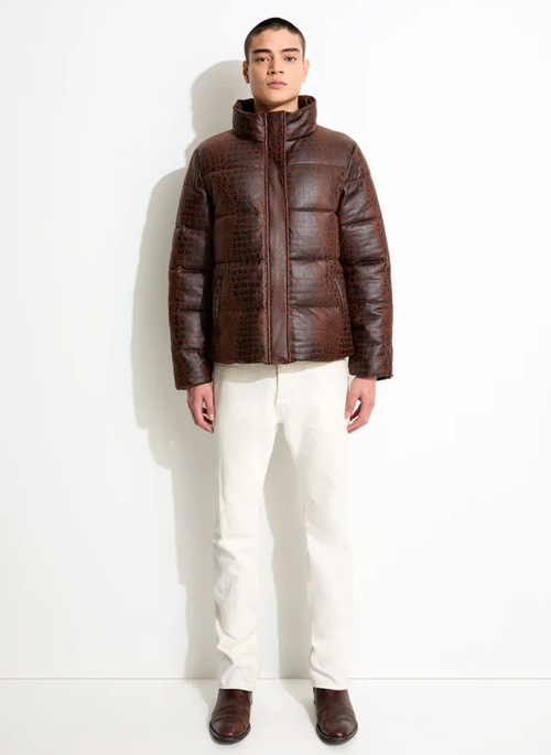 A reinvention of our classic vegan puffer silhouette, the croc illusion jacket is the ultimate cruelty-free athleisure style of the season. this piece features a lustrous mock croc vegan leather outer shell, a quilted bodice, and a padded neckline for added warmth.