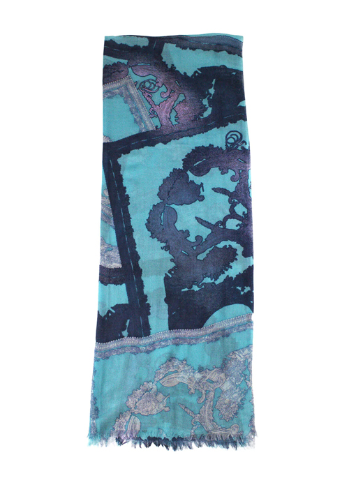The Iris is a our signature lightweight 100% cashmere in light blue featuring a contrasting floral design. It has eyelash fringe ends.