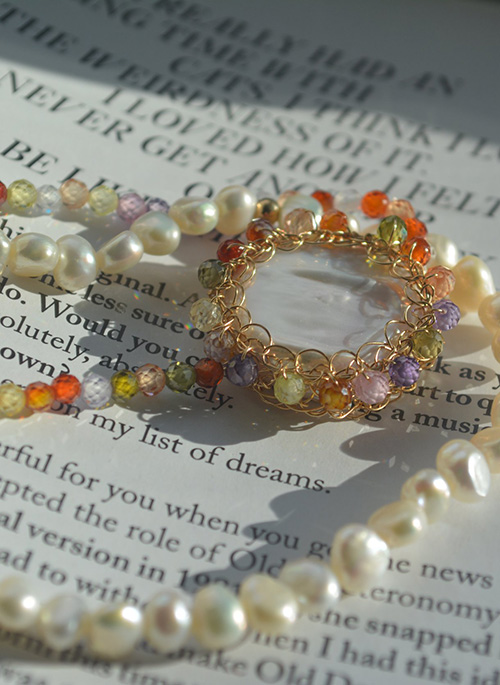 A lace-liked multi-layer necklace has been constructed artfully with crocheted 14K Gold filled wire and playfully strung dozen of mini multicoloured Cubic Zirconia stones around a lustrous iridescent classic white Baroque Freshwater Pearl.