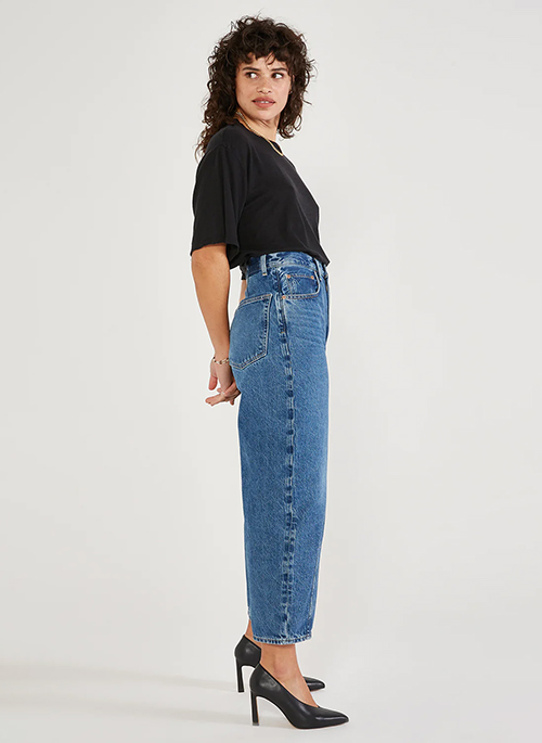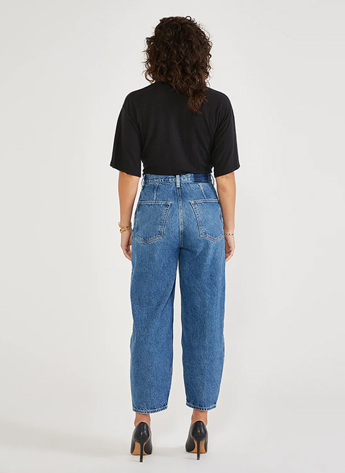 A sophisticated taper jean with a barrel-shaped leg and a high rise. Fit is roomy throughout, with a subtle pintuck accent at the ankle.