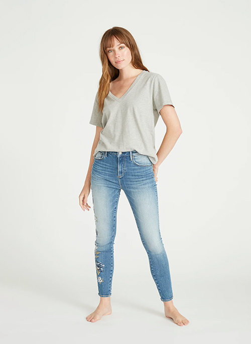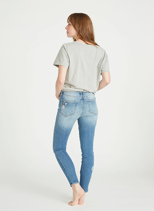 This flattering 10-inch rise Jackie jean is a twist on the classics. The Bluebell Fleur embroidery stays subtle against the medium wash while simultaneously standing out. Starting at the top of the front pocket and traveling down the side of the leg.Details: