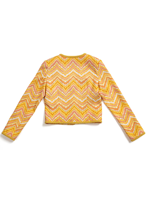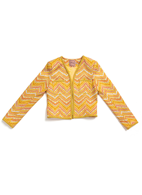 Yellow jacquard jacket with a round neckline. It has long sleeves, a comfortable lining, front pockets and beautiful decorative trimming.