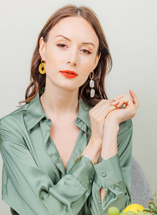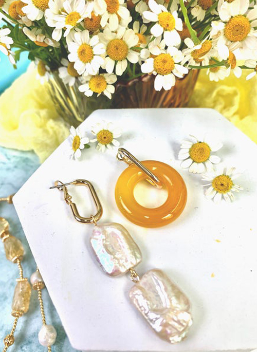 This pair of earrings is made of round olive jade and freshwater pearls with Japanese gold plated brass findings. The asymmetric design looks stylish and unique which can be worn with a blouse, dress, or knitwear for any occasion.