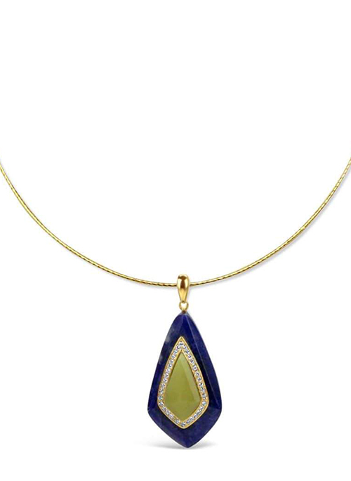 The City line collection introduces high - impact colour combinations and new angles on established forms. This taste - tempting necklace beholds a nostalgia of the Swinging Sixties. It is cast from gold-plated 925 sterling silver, set with jade, sodalite and shimmering cubic zirconia. Wear yours with shift dress silhouettes and geometric prints.