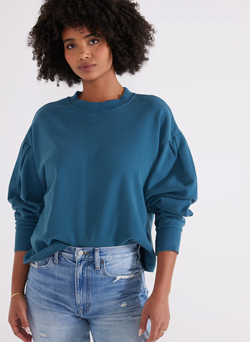 A modern sweat top adds a little drama with a pleated drop shoulder and a volume sleeve.