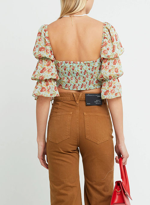 Tiered, chiffon puff sleeves create this dreamy blouse. Done in a gorgeous floral print with comfortable elastic finishes.