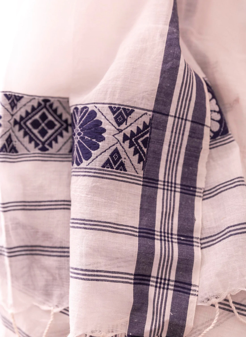 Handwoven on traditional wooden looms with a lovely decorative trim- this khadi white and indigo scarf is really a stunner! It's super sized so makes a statement with any outfit.