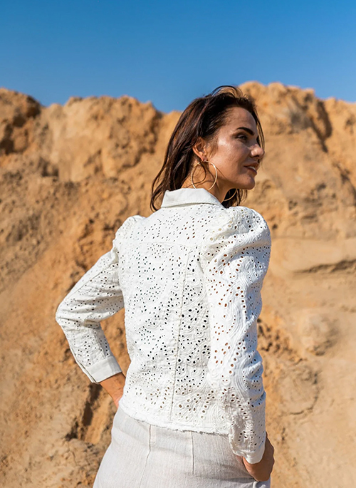 Quintessential and one of a kind, this all-over eyelet embroidered jacket will not only cover your shoulders when temperature drops but also make heads turn around.