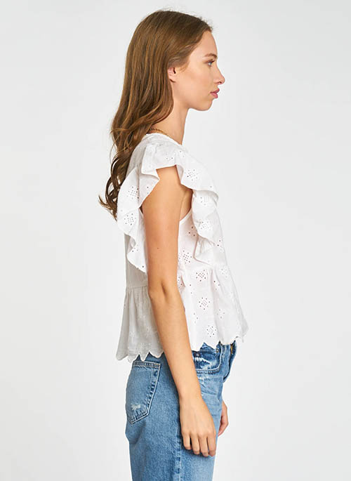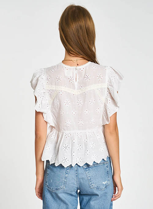 This ruffled flutter sleeve peplum top, is featured in a White eyelet fabrication. With an array of yoke and inset panel lace details, scallop edge hem, and cascading ruffles along the side seams, the Vabien blouse embodies the perfect blend of contemporary and traditional-inspired elements.