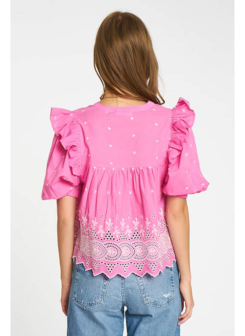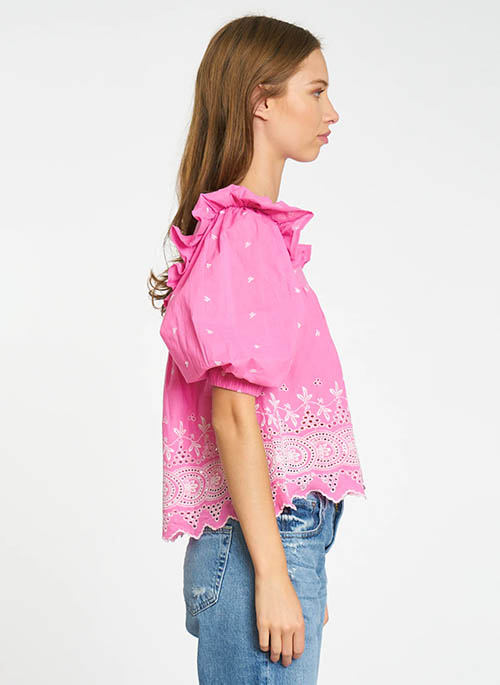 With its flowing shape and cascading ruffle detail, the Janice top is a fun and lightweight style with sophisticated details. Cut in a Fuchsia with White embroidery details, this blouse evokes a youthful look with bohemian undertones.