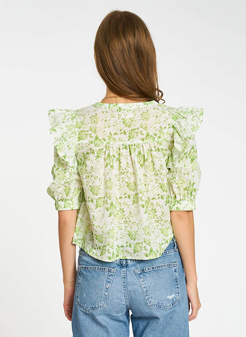 With its flowing shape and cascading ruffle detail, the Janice top is a fun and lightweight style with sophisticated details. Cut in a Green Garden floral print fabric, this blouse evokes a youthful look with bohemian undertones.