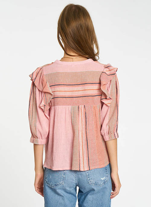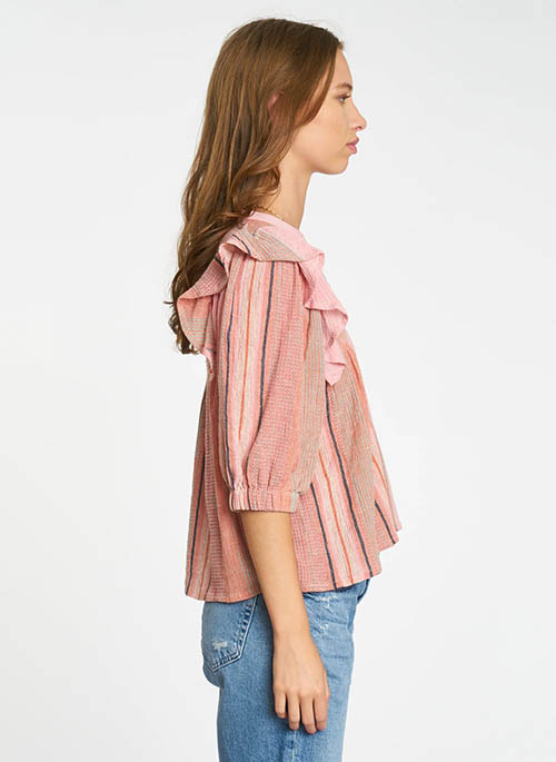 With its flowing shape and cascading ruffle detail, the Janice top is a fun and lightweight style with sophisticated designs. Cut in a Pink Multi Stripe woven, this blouse exemplifies the look of casual refinement.