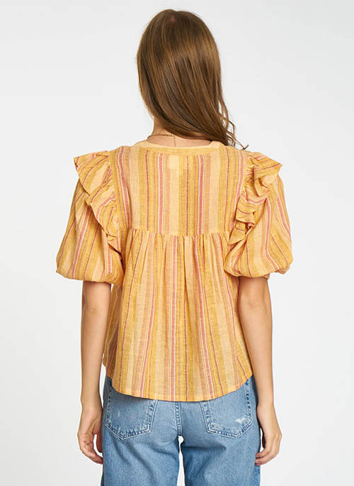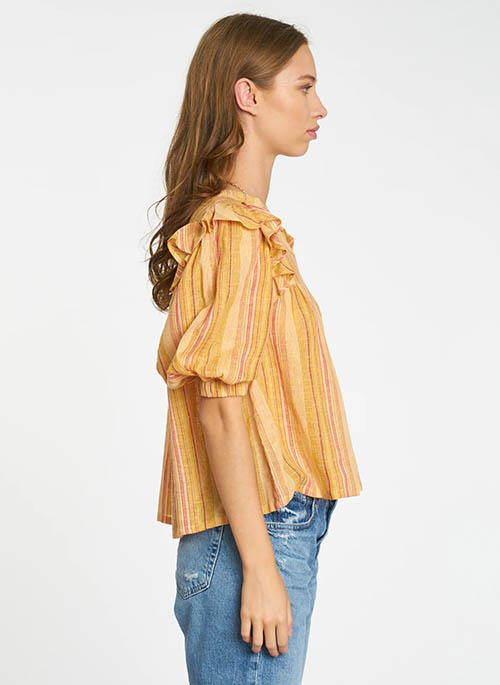 With its flowing shape and cascading ruffle detail, the Janice top is a fun and lightweight style with sophisticated details. Cut in a Yellow Multi stripe woven, this blouse evokes a youthful look with bohemian undertones.