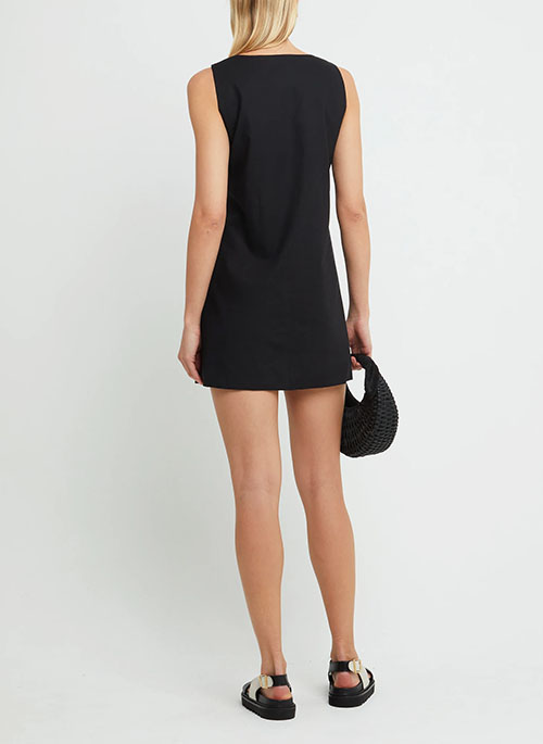 This mod-style mini is done with a gorgeous scalloped detail and oversized, covered button. Finished with functional pockets.