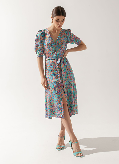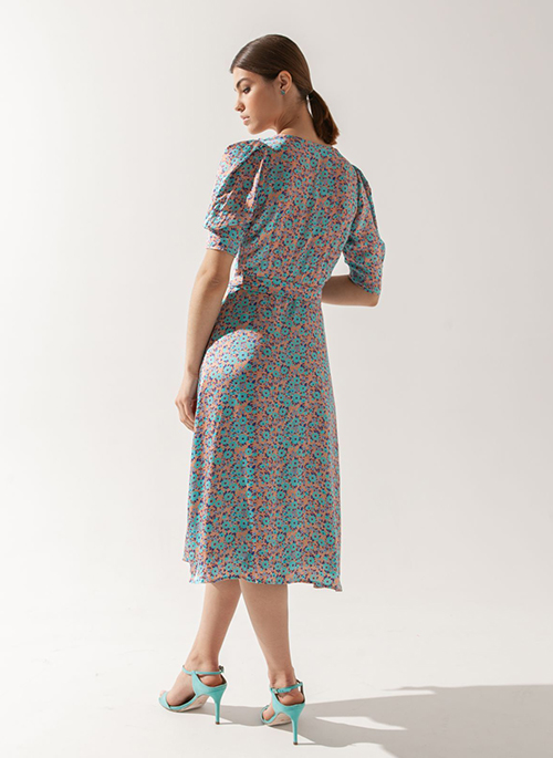 Tap into the world of nature with our Floral Print Midi Dress Jasmine. Featuring half-puffed sleeves, an A-shape silhouette and excellent tailoring, the dress is perfect for your next important event.