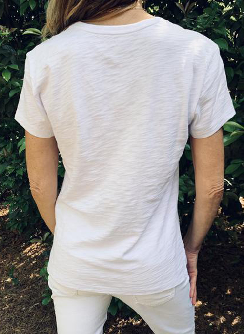 The perfect basic jeans V in our favorite white pima cotton slub! Super comfy and stylish with side vents and a slightly longer length in back. Typical tee shirt length with a high-low hem.