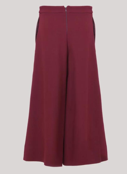 Burgundy wool crêpe culottes with yellow contrasting front band, side pockets and back closure with visible central zip. Head designed and made entirely in Italy.