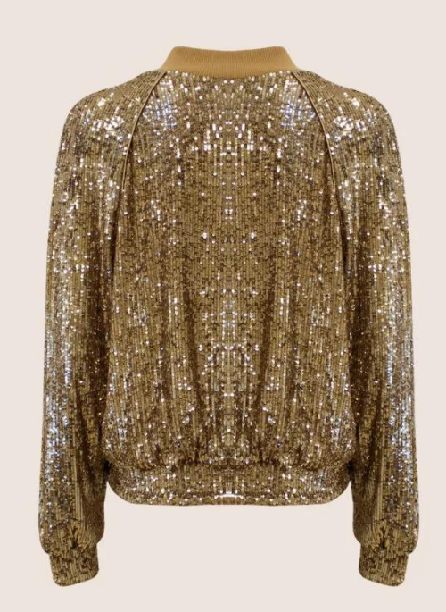 Limited edition bomber jacket in gold-colored micro-sequins with raglan sleeves, front pockets and golden ribbed knit collar. The seams are finished with tone-on-tone laminated profiles. The closure is front zip. Head designed and made entirely in Italy.
