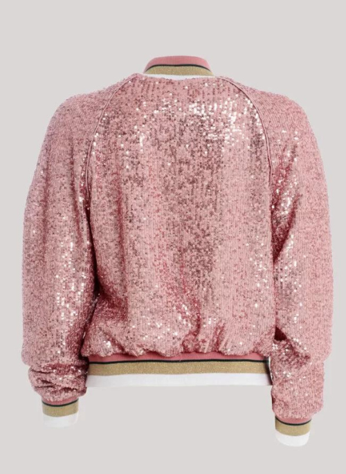 Short bomber jacket with raglan sleeves, zip closure and front pockets. Embellished with pink silk stitching. Made of pink sequin fabric with ribbed knit collar, cuffs and edges. Head designed and created entirely in Italy.