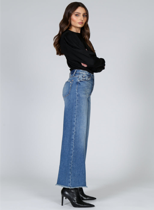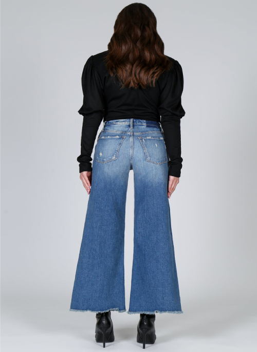 Bad decisions make good memories. A high-rise wide-leg jeans with a hidden button fly. Cut from our Vintage Rehab fabric for a luxuriously soft feel, Bad Decision is a dark blue wash with light whiskering and sanding along the thighs.