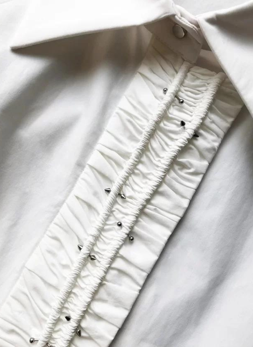 White cotton shirt with ruffled motif with piercing applications, high pleated cuffs. The buttoning is central and hidden, enriched by a visible piercing button on the neck