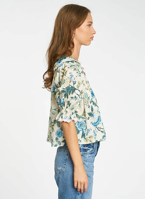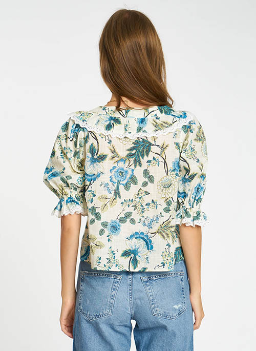 A simple playful blouse with romantic details, the Jodie Top featured in a Blue China floral print, is a stylish relaxed silhouette that fuses elegance with a little bit of fun. Its chic square neckline and 3/4 length balloon sleeves with elastic cuffs and ruffles, add dimension to the design.