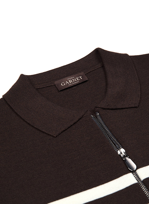 Long sleeve full-zip mock neck sweater in 100% Merino Wool with contrast stripes around the chest, rib-knit neck, cuffs, and waistband.