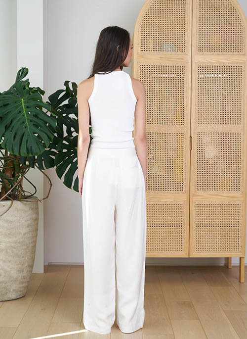 The Joomi relaxed-fit pleated pant with wide leg hem is cut in a classic, Eggshell cotton fabrication. It features dual, rectangular patch pockets and button closures, resting at your true waistline for a more comfortable and fitted silhouette.