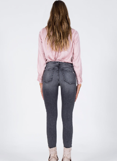 Our popular mid-rise fit is the talk of the town in a dark grey wash with slits at the knees.