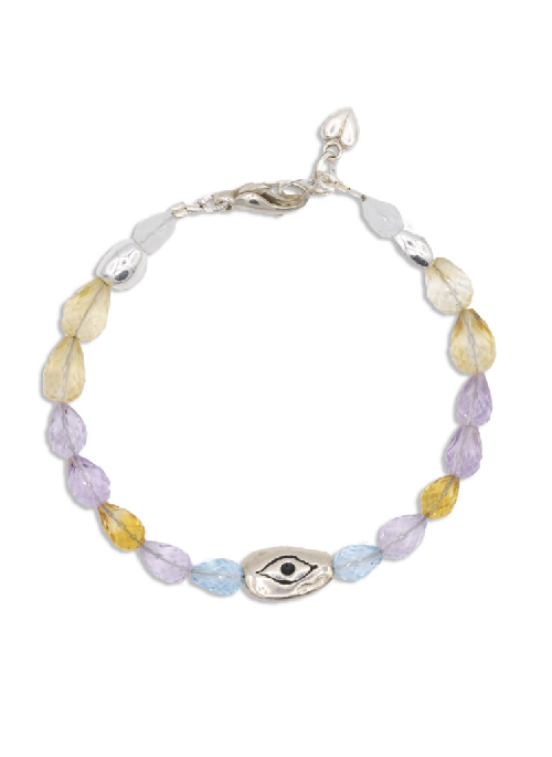 Beaded Juicy Fruit light briolette colours bracelet with details and fastenings in sterling silver. This design features an evil eye mother-of-pearl charm. Perfect for everyday wear and adding a little colour to your life.