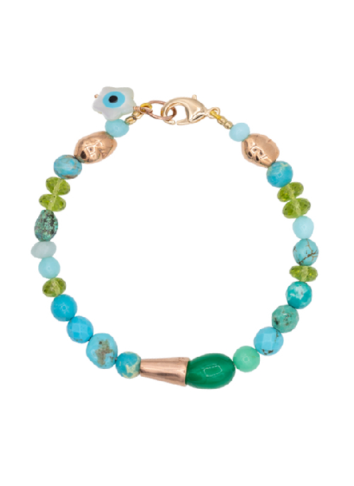 Beaded Juicy Fruit green agate, turquoise, chalcedony and peridot bracelet with details and fastenings in 18ct rose gold vermeil over sterling silver. This design features an evil eye mother-of-pearl charm. Perfect for everyday wear and adding a little colour to your life.