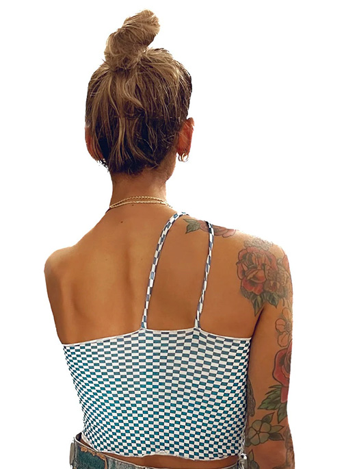 Fitted cropped tank-top with thin, front criss-crossing shoulder straps and a twisted bust detail. Low scooping asymmetrical front neckline. Featuring white exposed lettuce edges on a light-weight jersey knit fabric in a white/blue check print.