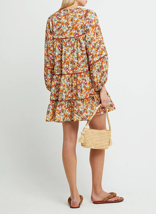 This easy, breezy dress is done with a flowy fit and fun floral print. Finished with tassled ties at the neck for a chic detail.