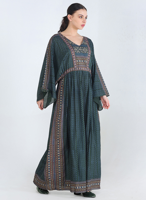 Moss green multi block printed kaftan maxi Moss green Silk multi