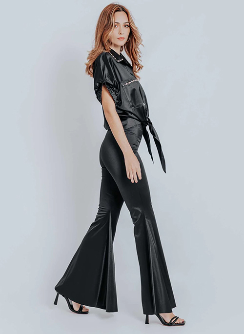 These trendy flare pants can be dressed up or down. They have a high waist, a form-fitting fit, and a black flared leg silhouette. The viscose is extremely soft and stretchy. Style with the matching cropped tank for an effortless look.