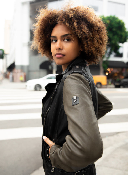 This chic colour-blocked leather jacket with olive green arms and a black torso makes a bold statement