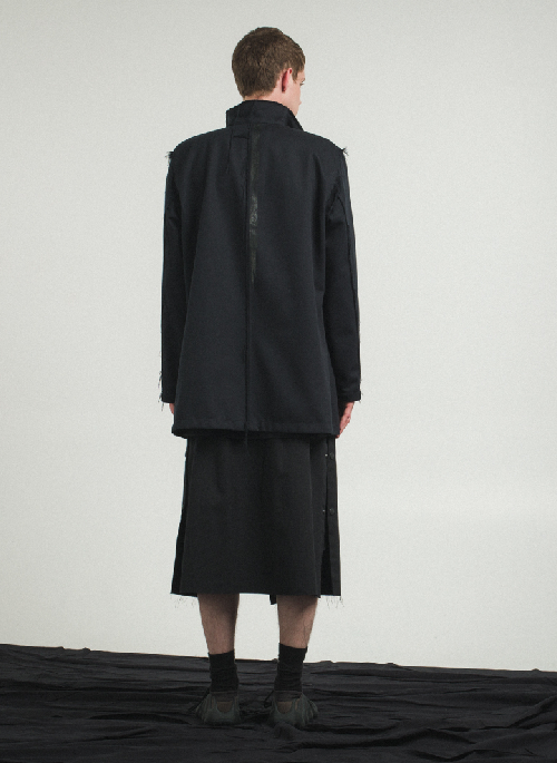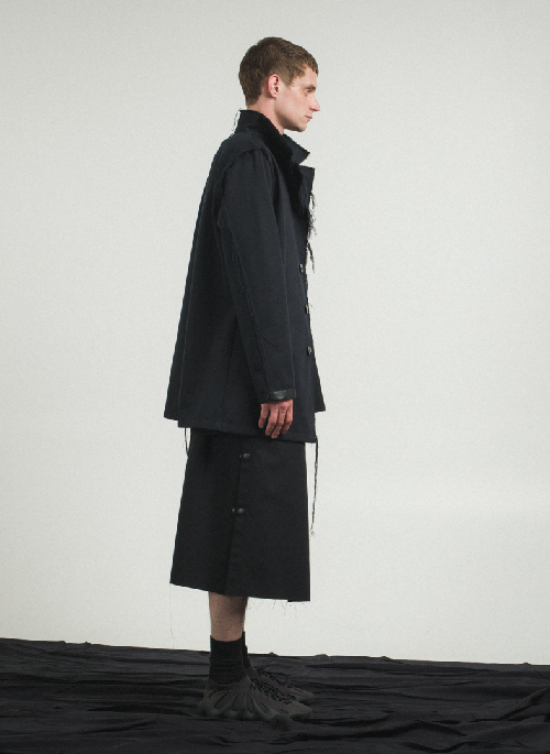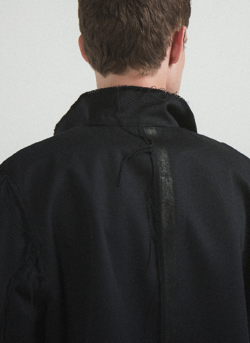 A loose-fit, medium-weight blazer with hand-painted details made from 100% organic cotton twill weave fabric. The raw hemming is secured with seams to keep the fabric from fraying further than intended by design making the garment more durable.