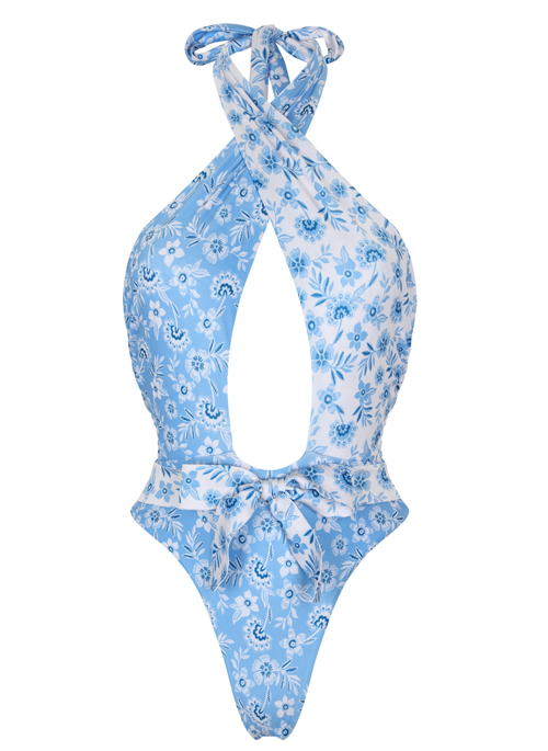 Karla Blue Flowes is a One-Piece swimsuit featuring front cut outs and delicate string detailing at the front.