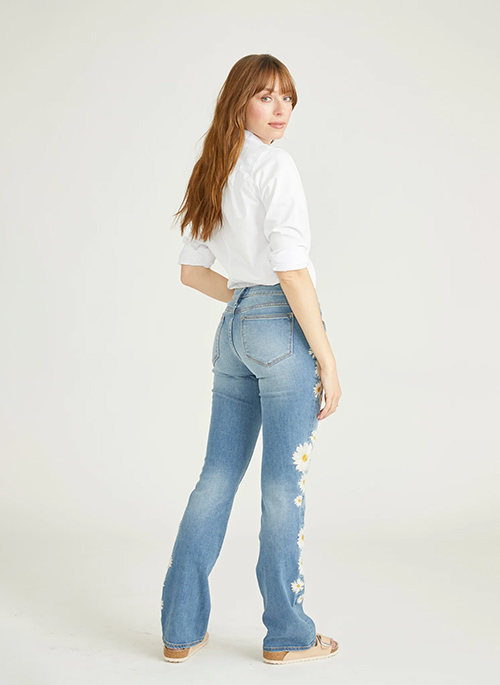 This Kelly wide leg in medium wash features light whiskering on the front pockets and Daisy Dream white and yellow embroidery on the sides of each leg.Details: