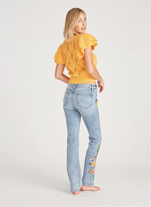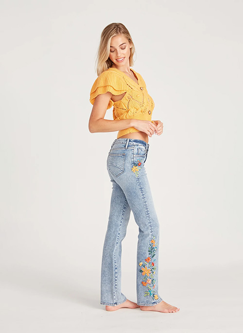 Kelly Boot Cut with Bright Tropical Floral Embroidered sides in Light Acid Wash.