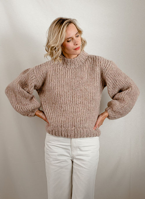 Hand knitted in 4 threads sweater , with medium high neck and mid ballon sleeves knitted in jersey fabric. Feel it over your skin, fall in love with its softness!