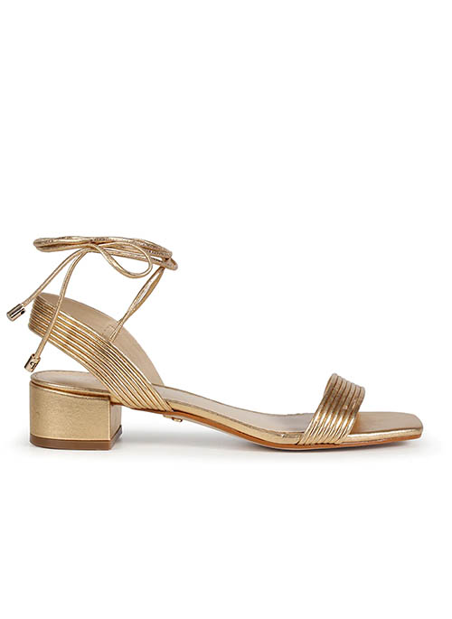 The Kim Sandal is made of leather. It features a square toe design and a low block heel. The classic construction includes a ribbed leather upper and a lace-up closure, finished with metallic tips featuring the Paula Torres monogram, adding charm to the piece.