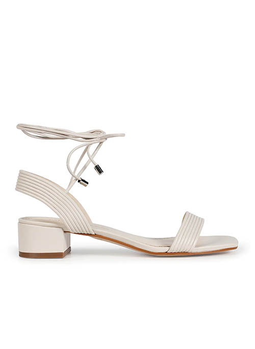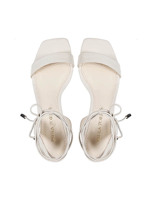The Kim Sandal is made of leather. It features a square toe design and a low block heel. The classic construction includes a ribbed leather upper and a lace-up closure, finished with metallic tips featuring the Paula Torres monogram, adding charm to the piece.