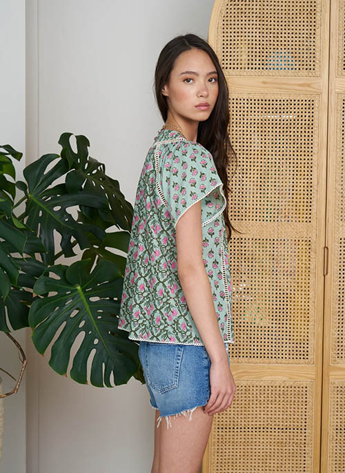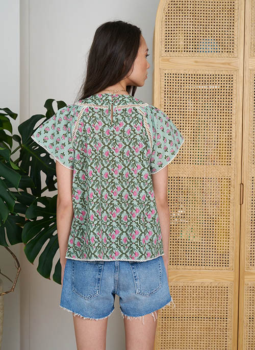 This flutter-sleeve Kimberly top is featured in a spring-inspired Green Block print. With an array of yoke and inset lace details, this blouse transforms from a traditionally-inspired design into an effortless, romantic style with discreet pattern delicacy.