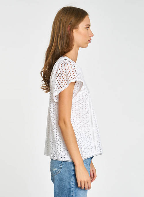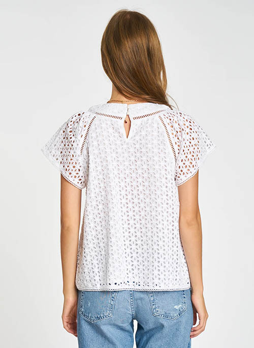 This flutter-sleeve Kimberly top is featured in a summer-inspired White eyelet woven. With an array of yoke and inset lace details, this blouse transforms from a traditionally-inspired design into an effortless, romantic style with discreet pattern delicacy.