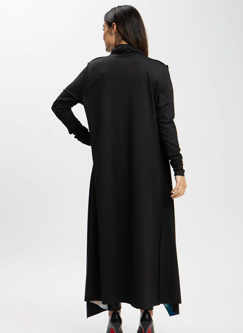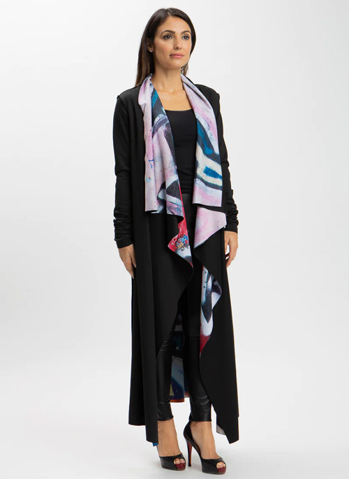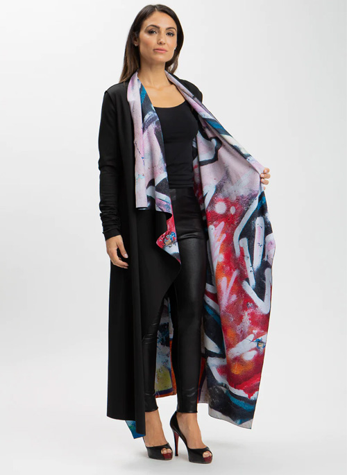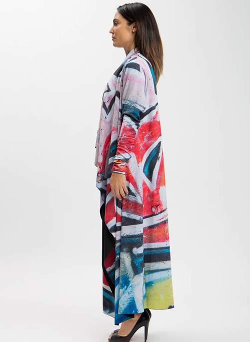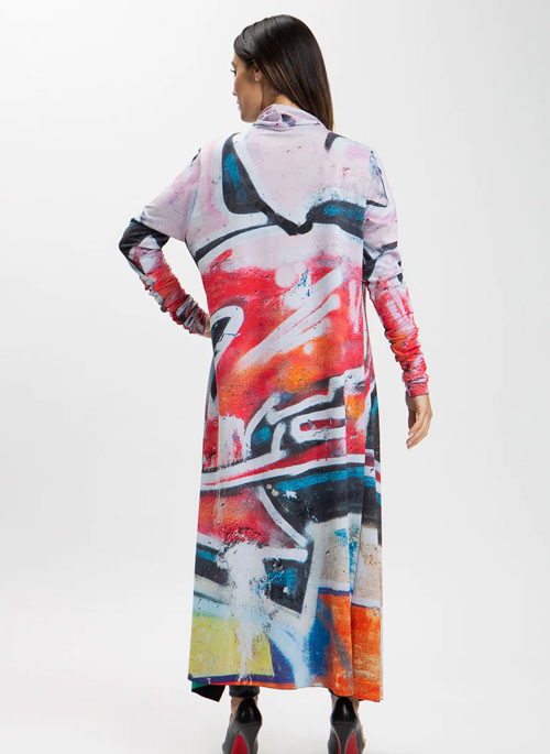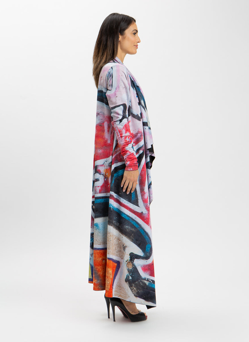 An ASTOURI signature, the Detroit Graffiti Inspired Duster features a show-stopping print that is reverisble with black on the inside with an easy-to-wear style day or night.
